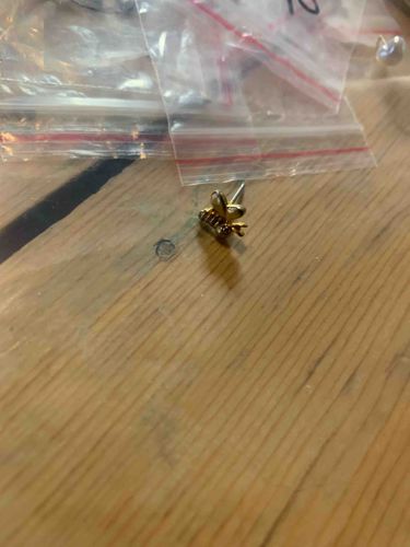 This item is a single stud earring crafted in the shape of a stylized bumblebee. The piece features a bright, polished yellow gold finish, likely 14k or 18k gold given the luster, though the base metal would require testing for confirmation. The bee is design-oriented with a textured, ribbed abdomen to simulate stripes and smooth, arched wings attached to a central thorax. The size is petite, approximately 5-7mm in length, making it a subtle 'micro-stud' popular in modern jewelry trends. It appears to be constructed from a cast mold with hand-finished polishing. The earring back is a straight post; however, the butterfly clutch or screw-back is missing in the image. There are no immediately visible maker's marks or hallmarks on the face, which is common for such small gauge jewelry; these would likely be found on the post. The condition appears excellent with minimal surface scratches and no visible tarnishing or oxidation. This contemporary style evokes whimsical nature-inspired motifs, often associated with luxury brands like Gucci or boutique artisanal jewelers from the early 21st century. The craftsmanship is high-quality, evident in the crisp transitions between the wings and the body of the insect.