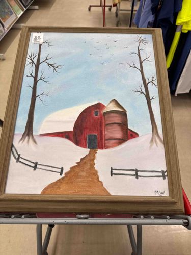 This is a rectangular, amateur-style folk art painting on canvas or board, presented in a simple, wood-grain finished frame. The composition features a snowy rural scene dominated by a large red gambrel-roof barn and an adjacent silo. The artwork uses a primary color palette of red, white, blue, and brown. Physical characteristics include two leafless, spindly trees flanking the barn and a flock of birds flying in a partially clouded blue sky. A brown path or dirt road leads the viewer's eye from the bottom foreground toward the barn's dark entrance. The execution is characteristic of naive art, with simplified shapes and a lack of complex perspective. Notable markings include the initials 'M W' and the date '01' (likely 2001) in white paint in the bottom right corner. The condition appears fair for a secondhand item; there is a white price sticker in the upper left corner of the frame that may leave residue upon removal. The frame itself shows minor scuffing. The craftsmanship suggests a hobbyist painter rather than a professional artist, given the flat application of color and basic shading techniques on the silo and snowy ground. The piece likely dates to early 2001.