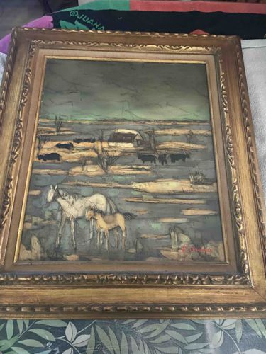 This item is an original oil painting by the Haitian artist D’orcino Toussaint, a notable figure in the mid-to-late 20th-century Haitian art movement. The work features a stylized landscape with a horse and foal in the foreground, set against a backdrop of a rural village with figures and small structures. The composition utilizes a distinct palette of muted blues, greens, and ochres, characteristic of Toussaint’s dreamlike, atmospheric style. The execution shows textured brushwork and fine linework that suggest a folk-art influence with sophisticated color layering. The piece is signed 'D. Toussaint' in red in the lower right corner. It is housed in an ornate, gold-finished wooden frame with a linen inner liner, typical of the 1960s or 1970s gallery presentations. The frame shows some minor surface wear and aging to the linen liner, while the painting surface appears to have a fine craquelure consistent with age, though it remains stable. The overall craftsmanship reflects the vibrant cultural aesthetic of Haitian painting, emphasizing narrative and natural beauty.