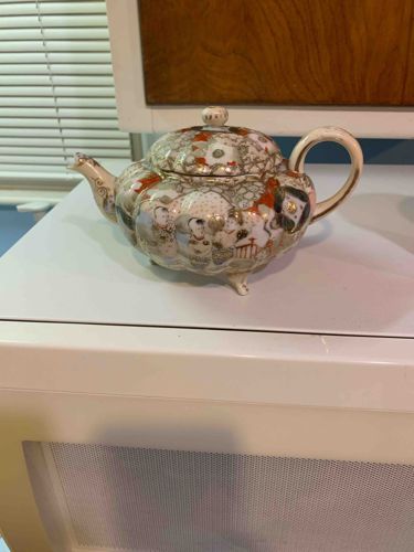 This is a vintage or antique Japanese Satsuma ware teapot, likely dating from the late Meiji era (late 19th century) to the mid-20th century. The teapot features a squat, globular body with deep vertical lobing, supported by three small tripod feet. The exterior is extensively decorated with hand-painted 'moriage' (raised enamel) depicting various figures, likely the Thousand Immortals or Arhats. The color palette is rich with iron red, forest green, Cream, and significant heavy gold gilding throughout. The lid is domed with a matching design and a simple rounded finial. The handle is a curved C-shape, while the spout is short and upturned, both accented with gold flourishes. High-quality craftsmanship is evident in the detailed facial expressions of the figures and the complex diaper patterns filling the background spaces. Regarding condition, there is visible wear to the gold gilding on the handle and spout, consistent with age and use. Small chips appear to be present on the feet, and there is a fine network of age-related crazing in the cream glaze, which is characteristic of earthenware produced in the Satsuma style. No maker's mark is visible on the exterior, though one may be present on the underside.