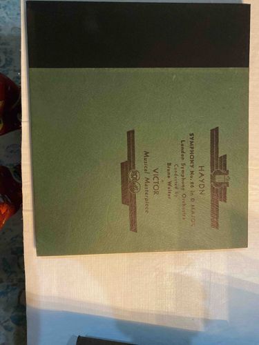 This is a vintage multi-disc 78 RPM record album set featuring Joseph Haydn's Symphony No. 86 in D Major, performed by the London Symphony Orchestra and conducted by Bruno Walter. The item is part of the prestigious 'Victor Musical Masterpiece' series, a collection noted for high-quality classical recordings during the mid-20th century. Physically, the album consists of a heavy-weight cardstock binder with a textured finish. The exterior features a two-tone design with a black spine and top border, contrasted by a muted sage green face. The front cover is printed with dark brown/burgundy typography and Art Deco-inspired graphic motifs. Central text identifies the composer, work, conductor, and orchestra. Regarding condition, visible shelf wear is present along the edges and corners, with minor scuffing on the flat surfaces. The binding appears intact but shows age-related darkening and some softening at the stress points. This specific release typically dates back to the late 1930s or early 1940s, representing the 'Golden Age' of orchestral recording on shellac discs. The craftsmanship reflects the durability required for heavy shellac records, featuring stiff internal sleeves designed to protect the fragile contents while offering a book-like presentation for the listener's library.