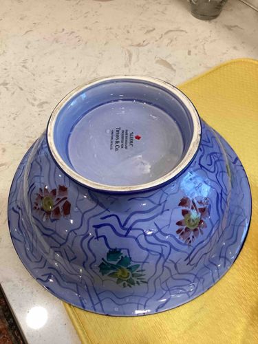 This is a large ceramic serving bowl featuring the 'Aliana' pattern, exclusively designed for and retailed by Tiffany & Co. The bowl is crafted from high-quality English earthenware or ironstone, characterized by a vibrant periwinkle blue ground. The exterior decoration consists of a hand-painted or transfer-printed aesthetic featuring deep blue wavy or 'scribble' geometric lines interspersed with stylized floral motifs in shades of burgundy, sage green, and yellow. The bowl has a deep, rounded form with a flared rim and sits on a slightly elevated, unglazed foot ring. The underside of the base is clearly marked with a red stamp that reads 'ALIANA MADE IN ENGLAND EXCLUSIVELY FOR TIFFANY & CO. © PATTERN NO. 6.13'. Physically, the bowl appears robust with a smooth, high-gloss glazed finish across the interior and exterior surfaces. There are visible water spots on the glazed underside, but the overall condition appears excellent with no immediate signs of chips, cracks, or significant crazing. This pattern likely dates from the late 20th century (circa 1980s-1990s), reflecting the playful and bold design aesthetic popularized by high-end retailers during that era. The craftsmanship is consistent with premium English production standards for luxury retail distribution.