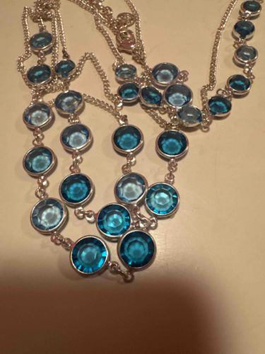 This item is a contemporary long-line necklace, likely a multi-strand or 'station' style, featuring numerous circular, faceted blue stones. The stones are bezel-set in a silver-colored metal, which appears to be a base metal or sterling silver-plated brass, given the uniform sheen and construction. The stones are vibrant turquoise or aquamarine blue glass or synthetic crystals, faceted to catch the light. Each circular station is linked by a fine curb-style chain. The construction utilizes jump rings to connect the bezel housings to the chain segments. Upon inspection, the metal shows minor surface scratches and light oxidation consistent with occasional wear, but no significant tarnish or structural damage is visible. The facets on several crystals appear sharp, suggesting a harder glass or cubic zirconia material rather than acrylic. The necklace includes a lobster claw clasp and a small circular metal hang-tag near the closure, though any specific designer hallmark is not legible from the image. This piece reflects a modern fashion jewelry style, possibly from the early 21st century, designed for versatility and layering.