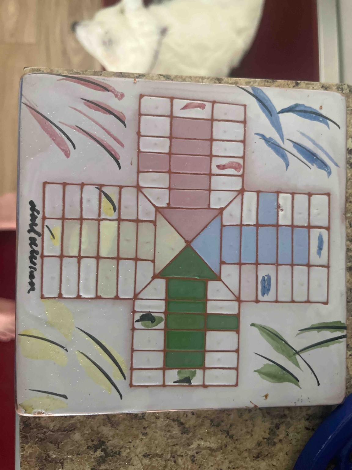 This item is a decorative square ceramic tile featuring a hand-painted game board design, specifically patterned after the traditional cross-and-circle game Parcheesi (Ludo). The tile appears to be approximately 6 to 8 inches square, crafted from a white glaze-coated ceramic material with a smooth, glossy finish. The design is rendered in a folk-art or whimsical style, utilizing a palette of pastel pink, blue, yellow, and a vibrant forest green. The board layout is hand-drawn with thin terracotta-colored outlines that vary slightly in thickness, indicating manual application. Each quadrant of the cross is accented with stylized feather or leaf motifs in the corners that correspond to the player colors. A notable feature is the handwritten script on the left margin, which appears to be a signature or a mark of the artist, though it is stylized and difficult to decipher completely. The condition shows minor signs of age and wear, including small chips along the bottom and left edges of the tile, revealing the underlying clay body. There is some slight surface craquelure visible in the glaze, which suggests mid-20th-century production. The craftsmanship is charmingly irregular, prioritizing a handcrafted aesthetic over industrial precision.