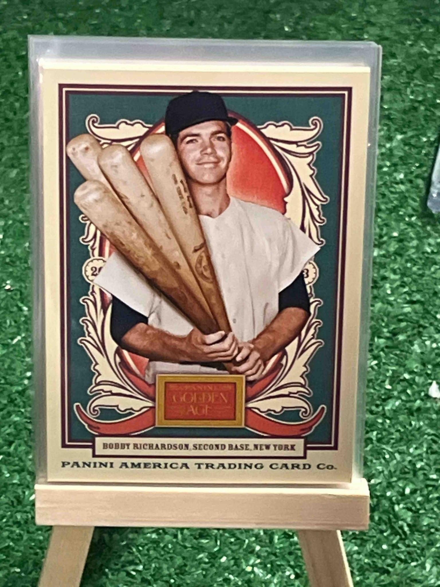 This is a modern trading card from the Panini America ‘Golden Age’ series, featuring former New York Yankees second baseman Bobby Richardson. The card is designed with a vintage, turn-of-the-century aesthetic, utilizing a cream-colored cardstock base with a deep forest green and red color palette. The central imagery shows a sepia-toned or colorized archival photograph of Richardson smiling while holding three baseball bats. The portrait is framed by an ornate, cream-colored Victorian-style scrollwork border set against the dark green background. A golden rectangular plaque at the bottom of the portrait reads 'GOLDEN AGE' in embossed lettering. Below this, the player's identification 'BOBBY RICHARDSON, SECOND BASE, NEW YORK' is printed in a clean serif font, followed by the manufacturer ‘PANINI AMERICA TRADING CARD Co.’ The card appears to be in excellent condition, housed within a clear protective plastic sleeve (top loader) and displayed on a small wooden easel against a green textured background. The centering of the card within its borders appears uniform, and the edges and corners visible through the sleeve appear sharp without obvious signs of fraying or wear. This series is known for its high-quality matte finish and commemorative nature, celebrating historical figures from sports and popular culture.