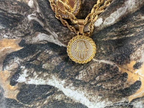 This jewelry piece consists of a circular medallion pendant featuring a central Hamsa (Hand of Fatima) symbol set against a field of clear pavé-set stones. The pendant is constructed from a yellow gold-colored metal, exhibiting a bright, polished finish. The border of the medallion is finished with a decorative rope-texture edge, echoing the design of the substantial 5mm to 6mm rope chain it is suspended from. The Hamsa symbol itself is outlined in gold-tone metal and filled with smaller micro-pavé clear stones, likely cubic zirconia or glass, given the overall mass-market luster. The pendant is attached to the chain via a polished, wide tapered bail. Visible in the background is a second similar gold-tone medallion, suggesting a layered jewelry style. The condition appears to be fair to good, with some light surface scratches on the bail and some darkening in the recessed areas of the rope texture, which may be intentional antiquing or slight oxidation. There are no obvious maker's marks visible in the image, but the style is contemporary, indicative of modern fashion or hip-hop jewelry trends from the 21st century. The craftsmanship is commercial-grade, with uniform stone setting and a heavy plating appearance.