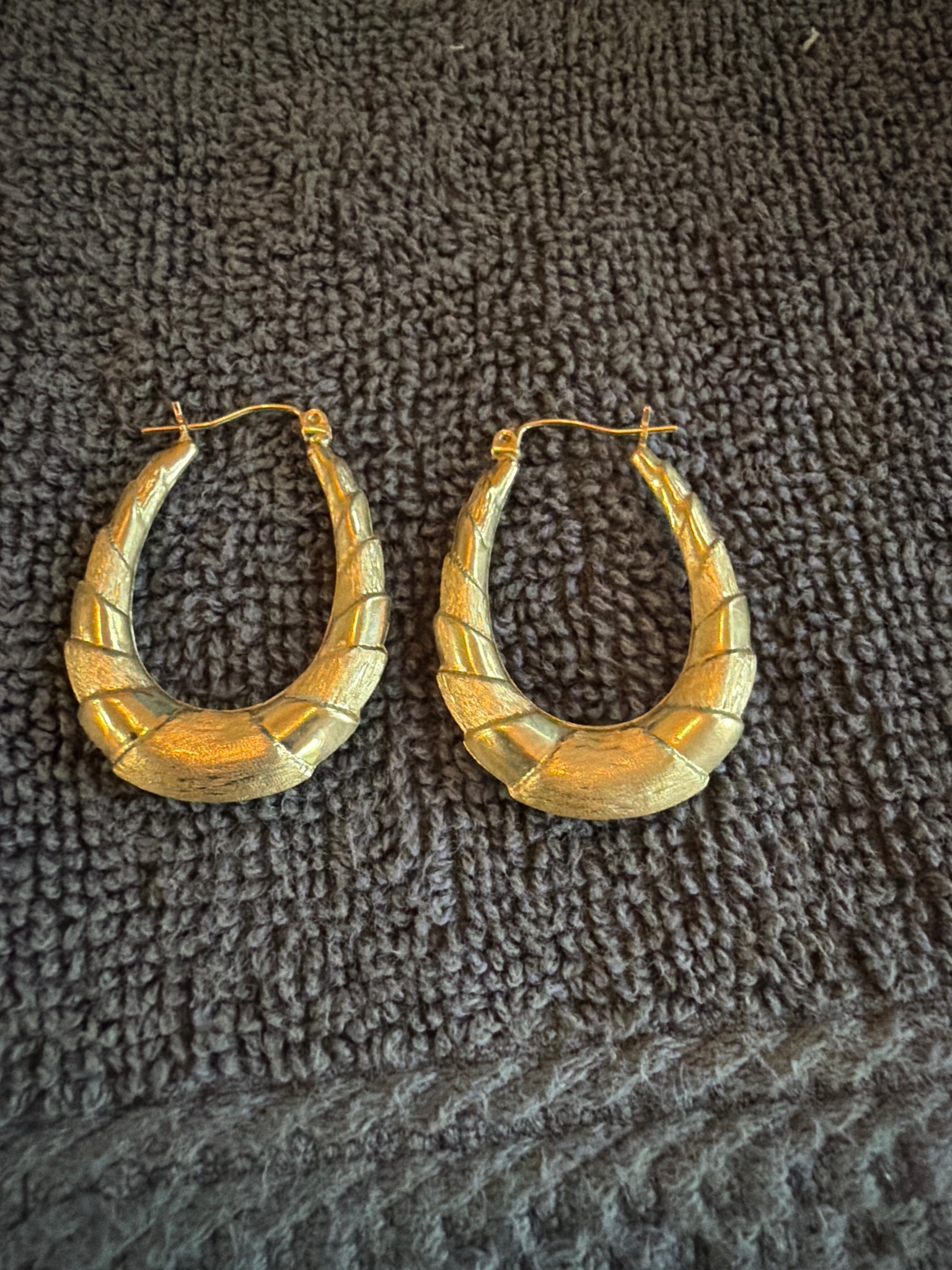 This pair of earrings consists of two large, oval-shaped tapered hoops crafted from a gold-toned metal, as indicated by the user context. The earrings feature a distinctive graduated 'shrimp' or 'croissant' style construction, where the body is thinnest at the top near the closure and thickest at the bottom center. The surface is decorated with a unique dual-texture finish: diagonal segments alternate between a high-polished smooth surface and a deeply Florentine or bark-like brushed texture. This contrast creates a dynamic visual effect that catches the light from multiple angles. The earrings utilize a traditional saddleback or 'omni' hinge closure with a curved ear wire that snaps into a notched cradle. In terms of condition, the metal shows a consistent warm patina and some minor surface abrasions consistent with gentle use. There are no obvious signs of structural damage or repair. The style is highly characteristic of late 20th-century jewelry design, specifically the late 1980s or 1990s, where bold, textured gold statement pieces were prominent. While maker's marks are not clearly visible in the provided image, the precision of the segments and the security of the clasp mechanism suggest mid-to-high level jewelry craftsmanship.