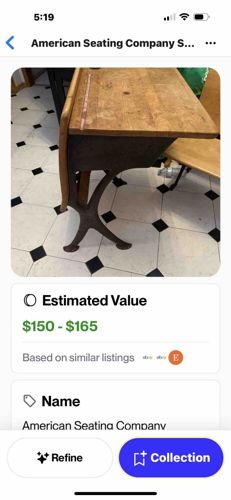 This is a late 19th to early 20th-century antique school desk, attributed to the American Seating Company. The piece features a solid wood top, likely maple or oak, showing a rich, aged honey-brown patina with visible wood grain and historical surface wear. It is supported by a classic black cast-iron frame with an ornate, curved 'Y' formation leg structure designed for floor mounting. The desk includes a distinctive drop-leaf component on the side, highlighting its functional industrial design. A small circular inkwell hole is visible on the upper desk surface, a common feature of the late Victorian and early 20th-century educational era. The cast iron shows a dark, consistent oxidation or black paint finish typical of pieces from this period. Condition indicates significant age with surface scratches, minor indentations on the wood, and some dusting/tarnish on the metalwork, which adds to its authentic antique character. The construction is heavy and robust, showcasing the industrial craftsmanship of the American Seating Company, which was the premier manufacturer of educational furniture during the turn of the century.