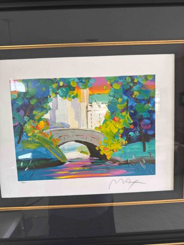 This item is a vibrant, multi-colored limited edition lithograph by renowned pop artist Peter Max, depicting the iconic Gapstow Bridge in Central Park, New York. The artwork features Max's signature Neo-Fauvist style, characterized by bold, expressive brushstrokes and a saturated palette of electric blues, greens, yellows, and magentas. The composition is framed by lush, stylized foliage in the foreground, leading the eye across a serene body of water reflecting a sunset sky toward the arching stone bridge, with a skyscraper silhouette in the background. The piece is hand-signed 'Max' in the lower right margin in a flowing, dark ink script and features an edition number in the lower left margin. The print is housed in a professional black wooden frame with an inner gold fillet and is mounted within a clean white mat followed by a secondary black mat board. The condition appears excellent with no visible fading, foxing, or moisture damage to the paper. The saturation of colors remains high, indicative of high-quality pigments and proper preservation. The framing is modern, likely dating from the late 20th to early 21st century, consistent with the artist's prolific output during this era. The craftsmanship is high, showing tight miters in the frame and precise matting.