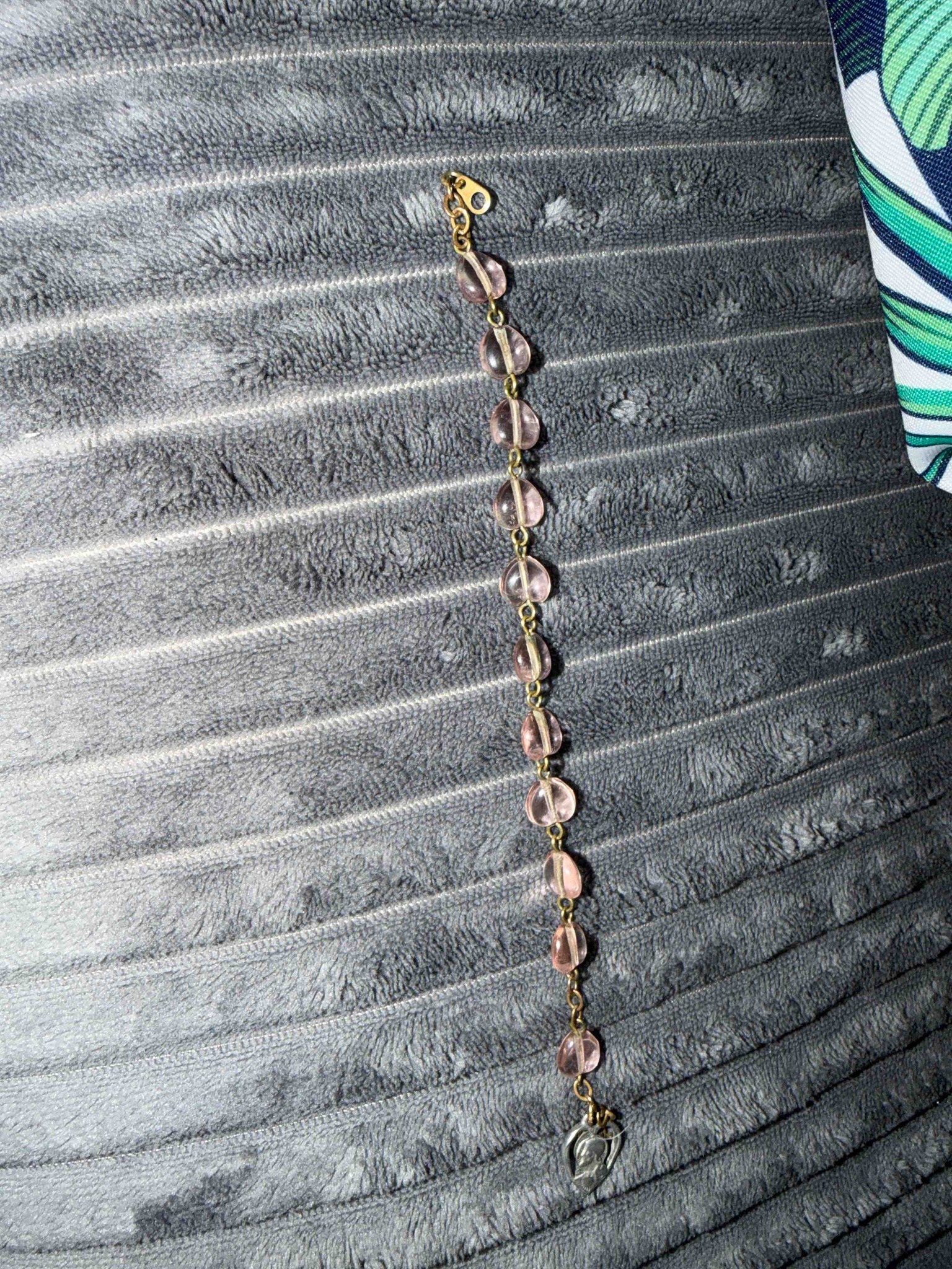 This item is a single-decade rosary bracelet, likely dating from the mid-to-late 20th century. It features ten translucent light pink beads with a subtle pearlescent or 'waterfall' finish, possibly made of molded glass or high-quality lucite. Each bead is teardrop-shaped and individually linked with gold-tone wire in an eyelet-and-loop construction. The metal is likely decorative gold-plated brass or base metal, showing minor age-appropriate surface oxidation and patina near the joints. A distinguishing feature is the silver-toned metal charm at the end, which is a heart-shaped Miraculous Medal (Medaille Miraculeuse), showing a relief of the Virgin Mary. The medal exhibits a different metallic finish than the gold-tone chain, suggesting it may be a later addition or intentional mixed-metal design. The opposite end features a gold-tone fold-over or flat jewelry clasp. Condition appears generally good with no visible chips to the beads, though the differing metals suggest a piece of modest religious costume jewelry rather than fine fine jewelry. The craftsmanship is consistent with mass-produced devotional items from the 1960s through the 1980s.