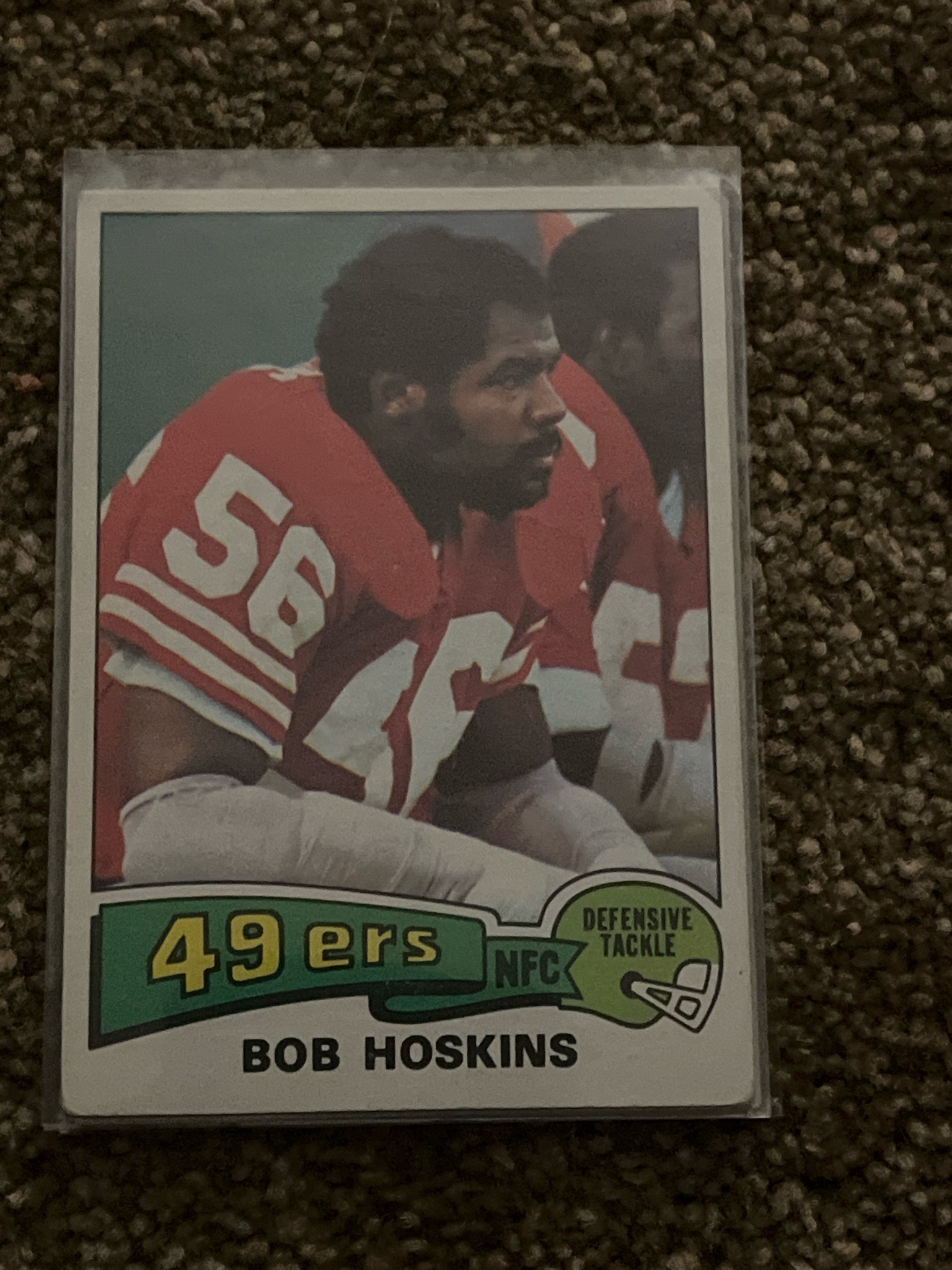 This is a vintage 1974 Topps football trading card featuring Defensive Tackle Bob Hoskins of the San Francisco 49ers. The card displays the classic 1974 design characterized by a candid color photograph of the player on the field, framed by a thin blue border against a larger white cardstock background. The bottom of the card includes a distinctive green banner graphic containing the team name '49ers' and the conference 'NFC', alongside a stylized green football helmet containing the player's position, 'Defensive Tackle'. The player's name, 'BOB HOSKINS', is printed in bold black uppercase letters at the very bottom. The card appears to be in a protective plastic sleeve. Regarding condition, the centering seems shifted slightly toward the left and bottom. The corners show signs of slight rounding and softening typical of ungraded vintage cards of this era. The surface colors remain relatively vibrant, featuring the deep red of the 49ers jersey. There are no immediate signs of major creases or surface stains visible through the sleeve, though minor edge wear is present. This piece of sports memorabilia represents the mid-1970s era of NFL card production by the Topps Chewing Gum company.