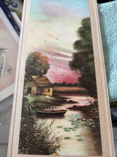 This item is a vintage lithographic print featuring a tranquil, pastoral landscape scene. The subject matter depicts a rustic cottage or cabin situated on the edge of a body of water, possibly a pond or narrow river, under a colorful sunset or sunrise sky tinted with shades of pink, yellow, and blue. A small rowboat is moored to a post in the foreground, and lily pads dot the water's surface. The composition includes tall, stylized trees and a flock of birds in flight, suggesting a mid-century illustrative style. The image is printed on what appears to be a textured, heavy-weight off-white or cream-colored cardstock, which is further embellished with a raised, embossed border framing the central image. The vertical format and the nature of the substrate suggest this may have been a high-quality greeting card, a decorative panel from a stationary set, or a small folio print. The colors remain relatively vibrant with a soft, matte finish characteristic of vintage offset lithography. There is no visible signature or maker's mark on the front. Condition-wise, the item appears well-preserved with some minor softening of the corners and very light age-toning along the paper edges, but no significant foxing, creases, or tears are immediately apparent.