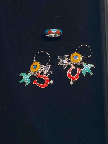 This jewelry set includes a low-profile band ring and a pair of decorative charm earrings. The ring features a geometric inlay of turquoise, reddish-orange coral, and black jet or onyx set into a polished silver-tone metal band, likely sterling silver. The earrings consist of large silver hoop wires supporting a cluster of colorful enameled and beaded charms. Each earring features a yellow sunflower-like center with a blue eye, a red horseshoe charm with white polka dots, a teal bird in flight, and a black abstract shape that may represent a thunderbird or animal. Small white beads or faux pearls are interspersed within the charm cluster. The vibrant palette of red, yellow, teal, and black suggests a late 20th-century Native American-inspired aesthetic, commonly referred to as 'Santa Fe style.' The pieces show minor signs of wear through Surface oxidation on the metal and small imperfections in the enamel application. The craftsmanship indicates a commercial production aimed at the artisan jewelry market. No visible hallmarking is present in the image, though they typically carry a '925' stamp for silver content.