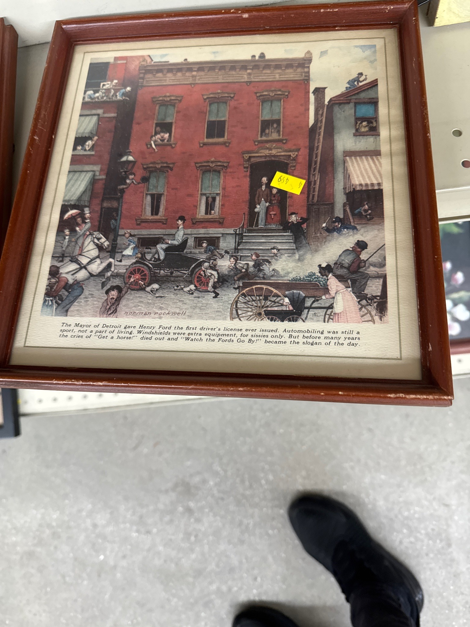 A square-format art print by Norman Rockwell housed in a simple, dark wood-tone frame. The illustration depicts a busy early 20th-century street scene with a red brick building as the backdrop. In the foreground, Henry Ford is shown driving one of his early motor vehicles, surrounded by the chaotic reactions of townspeople, including a woman pushing a cart and various figures watching from windows and the street. The print features a prominent facsimile ‘Norman Rockwell’ signature in the lower left of the image. Below the artwork, a descriptive caption provides historical context about Ford receiving the first driver's license from the Mayor of Detroit. Physically, the item shows signs of significant age and wear; the wooden frame has multiple instances of scuffing and loss of finish along the edges and corners. A yellow price sticker is affixed directly to the glass surface. The paper exhibits some yellowing or toning, consistent with mid-century mass-produced prints. This piece was likely part of a commemorative series or a magazine insert preserved for decor. The craftsmanship is typical of commercial framing for the home interior market, prioritizing accessible Americana themes popularized by Rockwell's work in the mid-1900s.
