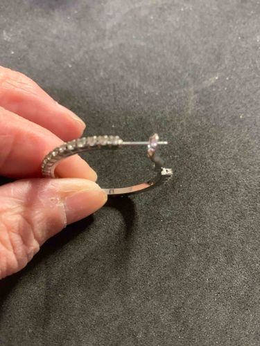 This item is a circular hoop earring, approximately 25mm to 30mm in diameter, constructed from a silver-toned metal, likely rhodium-plated sterling silver or stainless steel. The exterior circumference is embellished with a continuous line of clear, round-cut stones, which appear to be cubic zirconia or crystals based on their uniform clarity and light refraction. Each stone is securely held in place by a shared-prong or bezel-style setting that transitions smoothly into a polished metal frame. The earring features a post and friction back closure mechanism, commonly referred to as a butterfly clutch. The interior of the hoop has a smooth, high-polish finish. In terms of condition, the metal surfaces show minor surface scratches and faint signs of tarnishing consistent with light wear. All stones appear to be intact with no visible chips, though a coating of dust or skin oil is present, dulling the brilliance. No discernible maker's marks or hallmarks are visible in the current view, but the design is a contemporary 'Inside-Out' style popular in the late 20th to early 21st century. The craftsmanship is factory-standard with clean lines and symmetrical stone alignment.