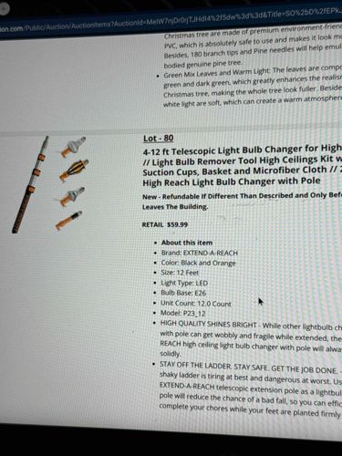 This is a versatile 12-foot telescopic high-reach light bulb changing kit manufactured by EXTEND-A-REACH. The primary component is an adjustable extension pole featuring a black and orange color scheme, constructed with multiple locking sections that allow it to expand from 4 feet to a maximum of 12 feet. The kit is designed for vaulted ceilings and difficult-to-reach fixtures, including various specialized attachments shown in the product imagery: a suction cup for flat bulbs, a wire basket 'grabber' for standard incandescent or LED bulbs, and a microfiber dusting or cleaning head. The pole is constructed with ergonomic thumb-lever locks for securing the length and a textured grip at the base for stability. According to the listing, the item is in 'New' condition and is compatible with E26 bulb bases. The construction emphasizes safety and durability, utilizing lightweight materials to prevent wobbling during high-reach tasks. It serves as a modern tool for household maintenance, specifically designed to eliminate the need for ladders when replacing bulbs or cleaning high surfaces.