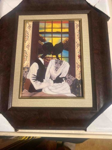 This is a vintage piece of African butterfly wing art, depicting a romantic silhouette profile of a couple in wedding-style attire positioned before a window. The silhouettes' heads are composed of iridescent black butterfly wings, while the background landscape visible through the window is constructed using vibrant yellow and orange wing specimens to suggest a sunset. The woman's dress is rendered in white textured material, possibly fabric or dried vegetation, with intricate lace-like patterning at the neckline. The artwork is housed in a multi-layered framing system: a thin gold-toned inner fillet, followed by a wide beige fabric-textured mat, and finally an outer mahogany-colored faux-wood frame with a marbled or burled texture. The piece displays characteristic stylings of mid-to-late 20th-century souvenir or decorative art often produced in regions like the Central African Republic or Madagascar. No visible signatures are present on the front, which is common for these hand-crafted folk art pieces. The condition appears fair to good; there is some noticeable wear on the bottom edge of the outer frame, and the protective plastic corner guards suggest it may have been recently stored or prepared for transport. The craftsmanship is high, evidenced by the delicate placement of the fragile organic materials and the layering of colors to create depth in the sunset.