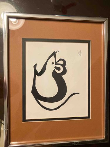 This original ink drawing on paper measures 5 by 7 inches and is attributed to artist Mildred Dienstag. The artwork features a whimsical, minimalist depiction of a mouse rendered in bold black ink strokes against a cream-colored or off-white paper substrate. The style is characterized by its fluid, Calligraphic linework, utilizing negative space and a single heavy contoured form to define the subject. A distinctive artist's monogram or cipher is visible in the upper right quadrant of the paper. The piece is professionally presented within a double-matted arrangement—a thin black inner mat followed by a secondary brown or copper-toned outer mat. The entirety is housed in a contemporary silver-toned polished metal frame, protected by glass. The condition appears excellent with no visible foxing, yellowing, or paper undulation, though there is a minor glare on the glass from the photographic capture. This type of mid-century minimalist graphic art is noted for its clean aesthetic and high-quality draftsmanship, likely dating from the mid-to-late 20th century.