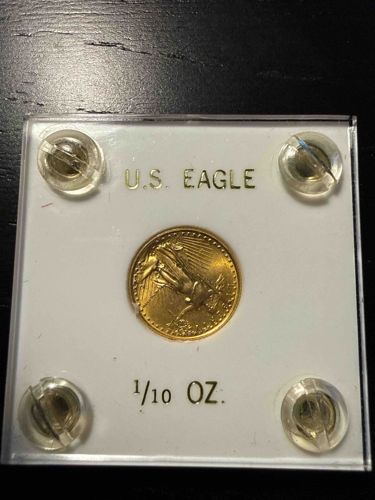 This item is a 1/10 ounce United States Gold American Eagle bullion coin, housed in a protective square acrylic screw-down holder. The coin features the classic reverse design by Miley Busiek, depicting a male bald eagle in flight carrying an olive branch to a nest containing a female eagle and her hatchlings. Constructed from 22-karat gold (.9167 fineness), the coin typically measures 16.5 mm in diameter and 1.19 mm in thickness. The strike appears sharp with high luster, suggesting a Brilliant Uncirculated (BU) condition. The field of the coin shows no significant abrasions or contact marks through the protective casing. The holder itself is a clear, multi-piece plastic assembly with four visible translucent screws at the corners, labeled with gold-toned lettering that reads 'U.S. EAGLE' and '1/10 OZ.' The holder shows minor surface shelf wear and light dust, but the coin remains securely sealed, preserving its numismatic and metal value. As an official U.S. Mint product, it carries a nominal face value of $5 USD, though its valuation is tied primarily to the spot price of gold and its collector demand as a fractional bullion piece. Based on the reverse design, this coin dates from 1986 to the present (Type 1 design used through mid-2021).