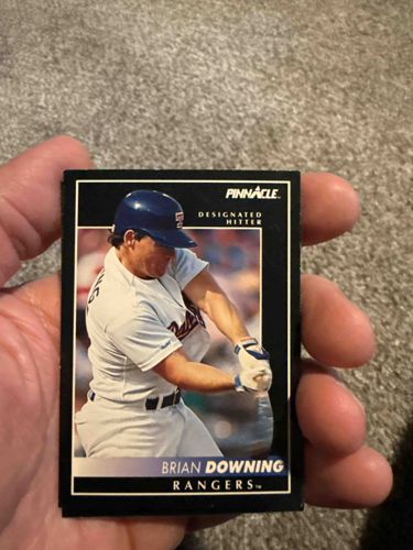 This is a 1992 Pinnacle baseball card featuring Brian Downing of the Texas Rangers, designated as a 'Designated Hitter'. The card measures the standard 2.5 by 3.5 inches and is printed on a heavy premium cardstock with a distinctive glossy black border design, which was a hallmark of the Pinnacle brand in the early 1990s. The front features a high-action color photograph of Downing mid-swing, showcasing the player in his Rangers home white uniform, blue helmet, and batting gloves. The 'Pinnacle' logo is printed in gold foil/white at the top right, with centered gold-toned text for his position and team name at the bottom. The condition of this specific example shows visible 'chipping' along the black edges, which is extremely common for this set due to the dark ink exposure on the paper fibers. Specifically, the upper right corner and left-hand edge show white flecks of paper loss. The centering appears slightly biased toward the right border. Despite the edge wear, the surface gloss remains intact and the color registration of the action shot is sharp. This card represents the 'Junk Wax' era of collecting but remains a nostalgic piece for fans of the veteran outfielder/DH known for his unique batting stance.