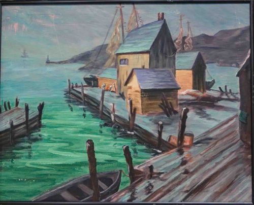 An original mid-20th century oil or acrylic painting on board or canvas depicting a serene maritime landscape, likely a New England or maritime fishing village. The composition features a cluster of weathered wooden structures, perhaps salt-box style shacks or processing houses, situated on a pier. The color palette is dominated by cool teals and greens in the water, contrasted by golden-brown and slate-blue architectural elements. Hand-painted with visible, expressive brushwork, the style suggests an Impressionist or Post-Impressionist influence popular among regional American artists between 1940 and 1960. The water shows rhythmic horizontal strokes to indicate movement and light reflection. Notable details include the hulls of small boats moored in the foreground and the faint silhouettes of larger sailing masts in the background against a muted sky. The painting is housed in a simple, dark wood frame. Condition-wise, the work appears largely intact, though there is a visible scratch or surface abrasion in the upper right quadrant and some minor corner wear on the frame. The absence of a signature in the lower corners suggests it may be signed on the verso or is the work of a talented student or hobbyist of the era. The heavy impasto and layering of pigments indicate a confident, painterly technique.