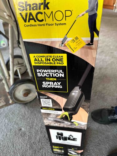The item is the original retail packaging for a Shark VACMOP Cordless Hard Floor System. The box features the iconic bright yellow and black Shark branding with large, bold sans-serif typography. This cleaning appliance is designed as a hybrid device that combines dry vacuum suction with wet spray mopping capabilities utilizing a single disposable pad. The packaging illustrates a slim, charcoal gray and lime green handheld/stick unit with built-in LED headlights. The unit is constructed primarily of lightweight plastic and metal components common to modern household electronics. The box shows visible signs of shelf wear, including minor scuffing along the edges and a prominent yellow Walmart clearance sticker marked at 20.00 dollars. Notable features mentioned on the packaging include 'powerful suction' and the 'all-in-one disposable pad' concept. Manufacture details attribute the product to Shark (SharkNinja Operating LLC), a contemporary producer of home appliances. The item represents a modern era of convenience-focused cleaning technology, likely manufactured within the last five years. The overall condition of the box is fair to good, though the packaging is purely functional and utilitarian, reflecting a mass-market consumer product rather than a collector's item.