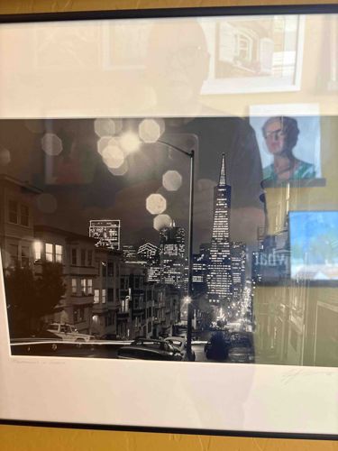 This item is a framed, black and white fine art photograph featuring a nocturnal cityscape of San Francisco, California. The composition centers on the iconic Transamerica Pyramid, towering over the illuminated neighborhood and urban streetscape. The photograph utilizes a long exposure or specific aperture settings to create prominent 'bokeh' or lens flare artifacts—circular light orbs that dance across the upper portion of the frame, adding a dreamlike, atmospheric quality to the urban scene. In the foreground, traditional San Francisco architecture and parked vintage-style vehicles suggest a late 20th-century setting, likely the 1970s or 1980s based on the car models. The photograph is presented behind glass in a white mat and a simple black frame. Notably, there is a handwritten pencil signature in the lower right margin and a title or edition note in the lower left margin, though the specific script is partially obscured by reflections in the provided image. The print appears to be on a high-quality matte or satin photographic paper. The condition seems excellent, with the matting showing no visible foxing or yellowing, and the photograph itself maintaining deep blacks and crisp highlights. The framing is consistent with gallery standards, providing a professional presentation for collector-grade photography. The craftsmanship is evident in the balance of the night-time exposure, managing the high contrast between the dark sky and the brilliant city lights without significant loss of detail.