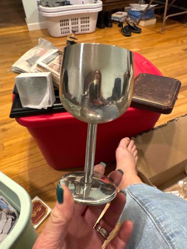 This item is a contemporary style wine goblet constructed from polished metal, likely stainless steel or silver plate. Its physical characteristics include a classic tulip-shaped bowl with a slightly tapered rim, a slim cylindrical stem, and a flat circular weighted base. The finish is highly reflective with a mirror-like shine, showing a silvery-chrome tone. In terms of construction, the piece appears to be composed of three distinct parts (bowl, stem, and base) joined together, typical of modern mass-produced barware. The item shows visible signs of handling, including fingerprints and light surface smudges on the reflective surface, but no major structural damage such as deep scratches, dents, or metal corrosion is immediately apparent. The design is minimalist and utilitarian, lacking ornate engravings or traditional scrollwork often found in antique pewter or sterling silver goblets, suggesting a manufacturing date within the late 20th or early 21st century. The craftsmanship is clean with smooth transitions between the components. While no maker's mark is visible in the provided angle, such items are frequently produced by contemporary home goods brands for specialized outdoor or high-durability dining use.