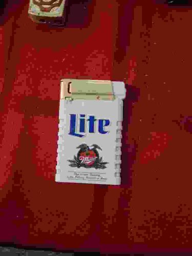 This is a vintage promotional butane lighter featuring Miller Lite branding, likely dating from the 1980s or 1990s. The lighter is encased in a white plastic housing with a distinctive rectangular silhouette and textured grip ridges along its vertical sides. The front face displays the classic 'Lite' logo in bold blue typography with a gold outline, positioned above the detailed Miller brewing crest that incorporates an eagle, grain stalks, and an 'M' inscribed in a red circle. Below the crest, the slogan 'The Great Tasting, Less Filling Premium Beer' is printed in a fine serif font. The lighter mechanism at the top appears to be a gold-toned metal flip-top or slider with a visible fuel nozzle and spark wheel assembly. The construction is typical of high-volume mass-produced breweriana memorabilia from the late 20th century. In terms of condition, the plastic shell shows minor surface scuffing and slight discoloration or patina consistent with age and use. There are no visible major cracks or missing pieces, though the functionality of the internal seals and flint would need testing. The print quality of the graphics is sharp, indicating it has not seen excessive pocket wear.