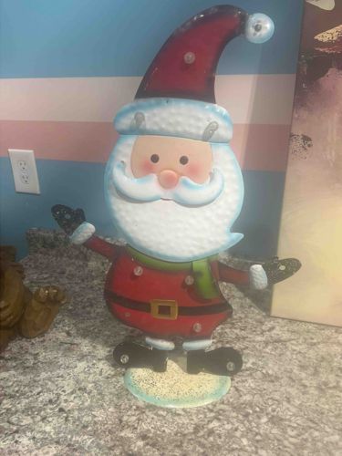 This item is a decorative standing Santa Claus figure, constructed from thin sheets of painted metal, likely tin or lightweight steel. The figure stands approximately 18 to 24 inches tall and features a two-dimensional silhouette design with a textured, hammered finish on the white beard and fur trim areas. The color palette consists of traditional Christmas holiday hues including a deep red suit and hat, a bright white beard, a green scarf, and black boots and mittens. A notable feature of this piece is the integration of small LED marquee-style lights distributed across the body, specifically on the hat, chest, and boots, intended for illumination. The figure is mounted on a circular, light blue or white base that appears to be finished with a glitter or iridescent coating to simulate snow. From a condition perspective, the item shows some signs of light wear consistent with seasonal use, including minor paint scuffs and possible surface oxidation at the metal seams. The craftsmanship is typical of mass-produced contemporary holiday decor from the late 20th or early 21st century, often sold in retail home goods stores. There are no visible maker's marks or signatures on the front of the piece.