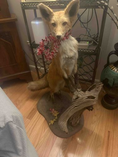 This item is a taxidermied red fox, appearing to be a juvenile or 'kit' specimen, mounted in an upright, alert posture. The fox features a typical reddish-brown fur on its back and sides, transitioning to a lighter, creamy white on its underbelly and throat. Its face exhibits characteristic markings with darker fur around the eyes and nose, and prominent, erect ears lined with light-colored fur on the inside. The eyes appear to be artificial, likely glass, and are dark in color, giving the fox a lifelike gaze. Currently, the fox is adorned with a festive red and white tinsel garland, suggesting it might be displayed for holidays. The mounting itself is on a naturalistic base designed to mimic a woodland floor. This base is irregular in shape, brown/grey in color, and features what appears to be a piece of natural driftwood or gnarled wood rising vertically, against which the fox's left paw is positioned. Adornments on the base include a few small, artificial autumn-colored leaves, indicating an attempt at a natural habitat setting. The overall condition of the taxidermy seems good, with no obvious signs of significant fur loss, matting, or deterioration visible from the image. The craftsmanship appears competent, with a realistic pose and careful fur preparation. While no maker's marks or signatures are visible, such pieces are typically professionally prepared by taxidermists. The style suggests it could be from the mid to late 20th century or early 21st century, as taxidermy techniques have remained relatively consistent for depicting natural poses. The unique aspect is the pose, suggesting an inquisitive or listening stance.