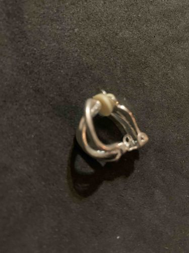 This item is a single clip-on earring featuring a sculptural, interlocking crossover design. It is constructed from a non-precious silver-toned base metal with a high-polish finish. The aesthetic is contemporary, likely dating from the late 20th century to the early 21st century. The earring utilizes a mechanical paddle-back clip mechanism, which includes a small off-white or cream-colored circular comfort pad made of a soft plastic or rubberized material. This pad shows significant yellowing and hardening consistent with age. Physically, the earring measures approximately 15mm to 20mm in height. The metal surface exhibits minor surface scratches and light tarnishing, particularly in the recessed areas where the curved bands intersect. There are no visible maker's marks, hallmarks, or designer signatures in the provided image, suggesting it may be a mass-produced bridge or costume jewelry piece. The craftsmanship is standard for commercial fashion jewelry, with a focus on fluid, organic lines and a seamless appearance between the 'intertwined' metal bands. The condition is fair to good, with the primary sign of wear being the discoloration of the comfort cushion and general micro-abrasions from handling.