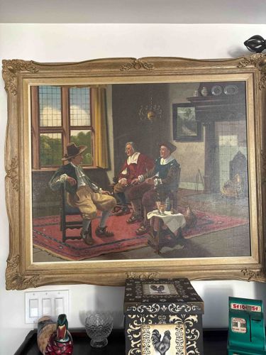 This item is a large-format genre painting, likely oil on canvas or a high-quality textured print on board, depicting a narrative scene of three men in 17th-century style costume interior. The figures are seated in a rustic but well-appointed room featuring a prominent fireplace, a leaded glass window, and a red patterned rug. The man on the left wears a brown wide-brimmed hat and yellow breeches, while the two men on the right are dressed in red and blue doublets with white collars. The composition suggests a social gathering, possibly reflecting Dutch Golden Age or Romanticist revival influences. The art is housed in an ornate, Victorian-style rococo gilt frame with floral scrolling at the corners and a burnished gold finish. The frame shows minor signs of aging with a slight patina and small abrasions consistent with mid-20th-century decorative pieces. The canvas/surface appears stable with no major flaking or visible restoration. The quality of the brushwork and the detailed interior elements (including metalware on the mantel and a separate landscape painting on the wall within the scene) point to a mass-produced or studio-style decorative work from the mid-to-late 20th century intended for a traditional home library or study.