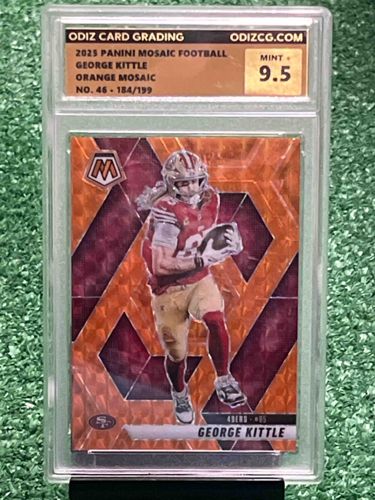 This is a professionaly graded modern sports trading card featuring George Kittle of the San Francisco 49ers. The card is part of the 2023 Panini Mosaic Football set, specifically the 'Orange Mosaic' parallel variety. It features a vibrant, geometric 'mosaic' background pattern in bright orange and deep maroon, complementing the player's team colors. George Kittle is depicted in mid-action, wearing his away white and red uniform. The card is encased in a rigid clear plastic protective slab from 'Odiz Card Grading'. The grading label at the top indicates a numerical grade of 'Mint+ 9.5', suggesting high-tier preserved condition with minimal to no visible surface wear, sharp corners, and strong centering. A crucial valuation detail is the serial numbering noted as '184/199', signifying it is a limited print run. The card utilizes Panini's signature Opti-chrome technology, providing a metallic, reflective finish. The front features the 'M' Mosaic logo and the player's name at the bottom, while the branding and serial numbering details are documented on the header tag.