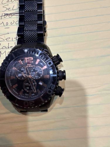 This is a large-format men's wristwatch, specifically an Invicta Pro Diver chronograph. The watch features a black ion-plated stainless steel construction for both the case and the triple-link bracelet, which exhibits a distinctive diamond-pattern knurling on the center links. The case is equipped with a unidirectional rotating bezel with elapsed time markings and oversized screw-down style pushers and a crown, also featuring knurled textures for enhanced grip. The dial is black with a textured carbon fiber or sunray finish, adorned with rose gold-tone Arabic numerals at the 12 o'clock position and matching baton indices. It contains three sub-dials for chronograph functions (60-second, 30-minute, and 24-hour) and a date window positioned between 4 and 5 o'clock. The hands are luminous for visibility in low light. In terms of condition, there is visible wear to the black plating on the sharp edges of the bezel and lugs, revealing the silver stainless steel beneath, which is common for ion-plated budget watches. Smudges and minor dust are present on the crystal and case. The craftsmanship is typical of high-volume contemporary fashion watches, emphasizing a bold, 'tool-watch' aesthetic with substantial weight and presence. It likely dates from the 2010s to the present.