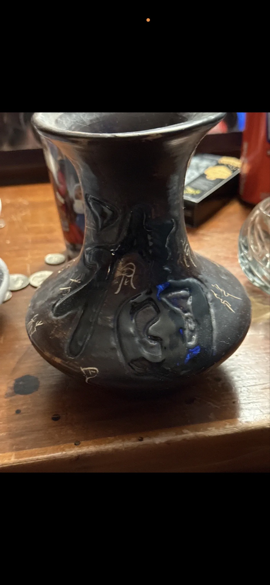 This item is a bulbous ceramic vase featuring a flared rim and a tapered neck, finished in a dark, metallic glaze reminiscent of traditional Japanese Temmoku or Tenmoku stoneware. The body of the piece is decorated with a unique combination of high-relief sculptural elements and fine-line sgraffito or incised calligraphy. The primary motif consists of large, raised abstract forms with a glossy black and deep blue crystalline-like finish that provides a tactile contrast to the matte, earth-toned base glaze. Throughout the rounded body, smaller symbols resembling archaic characters or stylized script are etched into the surface, highlighted with a light-colored pigment to increase visibility. In terms of condition, the vase shows visible signs of wear consistent with age or heavy handling; there is notable loss of the dark surface finish along the outer edge of the rim, revealing a lighter ceramic body underneath. Some surface abrasions and dust accumulation are present, particularly on the lower shoulder of the vase. The overall aesthetic suggests a mid-to-late 20th-century artisan production, possibly influenced by Min'yo folk art traditions. The craftsmanship is expressive and asymmetrical, favoring an organic, studio-pottery feel over industrial precision.