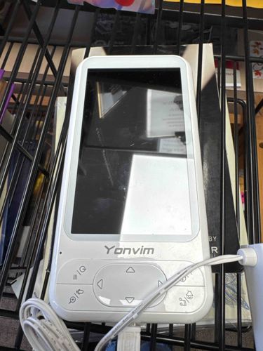This is a handheld electronic parent unit for a Yonvim brand digital video baby monitor system. The device features a white plastic rectangular chassis with rounded corners and a large, dark LCD glass screen prominently displayed in the upper half. Below the screen, the brand name 'Yonvim' is printed in a grey sans-serif typeface. The control interface at the bottom includes a circular D-pad for menu navigation and several tactile function buttons, including power/menu, zoom/camera switch, a talk-back button, and a music/lullaby play button. A small hole to the left likely indicates the microphone for two-way communication. A white USB charging cable is currently plugged into the bottom port, with another cord visible on the side. The screen shows some minor surface smudging and light lint, but no major cracks or deep scratches are visible. The plastic casing appears to be in good used condition with minimal yellowing. Based on the design and technology, this item likely dates to the late 2010s or early 2020s. It represents a typical consumer-grade childcare monitoring device designed for portable residential use.