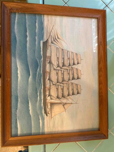 This item is a rectangular maritime artwork depicting a three-masted clipper ship under full sail. The composition features the vessel angled against a series of stylized, vertical blue and white waves on the left-hand side, suggesting a brisk movement across the ocean. The color palette is composed of muted tones including shades of seafoam blue, white, off-white, and sepia for the ship's rigging and hull details. The piece is housed in a simple, mitered wooden frame, likely oak or a similar grain-heavy wood, finished with a medium honey-brown stain. The artwork appears to be a mass-produced lithograph or print from the mid-to-late 20th century (circa 1960s-1980s), rather than an original watercolor or oil painting. Notable details include the intricate rendering of the rigging and multiple square sails. Regarding condition, there is visible yellowing/toning of the paper consistent with age and exposure to light. The frame shows minor scuffs and separation at the miter joints. There appear to be some small foxing spots or surface debris under the glass, and a faint signature or title is visible in the lower left quadrant among the waves, though it is not clearly legible from the image. The craftsmanship represents standard commercial decorative art of its era.