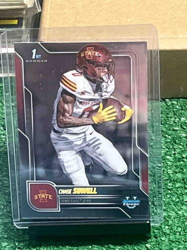 This is a 2023 Bowman Chrome University trading card featuring wide receiver Chase Sowell in his Iowa State University uniform. The card measures standard 2.5 by 3.5 inches and is constructed from premium chrome cardstock, characterized by its reflective, metallic finish. The design features a dark background with geometric silver and maroon accents, consistent with the Iowa State team colors. A prominently displayed '1st Bowman' logo is located in the top-left corner, signifying it as the player's first official card under the Bowman brand. The bottom section includes the player's name in yellow and white text, his team 'Iowa State,' and position 'WR,' alongside the 'Bowman Chrome' logo on the right. The player is depicted in an action pose, carrying a football and wearing a maroon helmet and a white jersey with cardinal and gold stripes. In terms of condition, the card appears to be in an 'unprocessed' state, housed in a plastic top loader and penny sleeve for protection. The centering from left to right seems slightly biased towards the right, which is common for this series. There are no immediate visible signs of surface scratching, corner blunting, or edge chipping, though the metallic surface is prone to faint 'refractor' lines or minor print dots under magnification. The craftsmanship reflects Topps' manufacturing standards for the Chrome line, utilizing high-gloss UV coatings for durability and visual appeal.