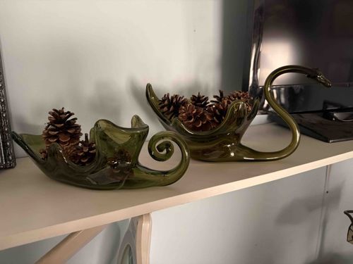 This set consists of two sculptural art glass decorative items in a rich olive or avocado green transparent hue, typical of mid-century aesthetics. The primary piece is a swan-form bowl featuring an elegant, elongated neck that curves upward and tapers into a stylized head, with a deep, lobed vessel body designed to hold small objects. The secondary companion piece is a snail or nautilus-inspired bowl, characterized by a tight, decorative spiral scroll at the front end and similar undulating, scalloped edges that form a cradle-like vessel. Both pieces are manufactured from heavy, hand-pressed, or hand-blown glass, showcasing the fluid, organic lines popularized by companies like Viking Glass or L.E. Smith during the 1960s and 1970s. The glass contains minimal inclusions, though subtle air bubbles may be present upon close inspection, which is common for art glass of this era. The surface appears to have a high-gloss finish with no significant clouding or 'sick glass' syndrome visible. There are no obvious chips or cracks in the curving extremities, which are vulnerable points. The bases are likely ground flat to ensure stability. These items represent high-quality domestic glass production from the American mid-century period, and their excellent clarity suggests they have been well-maintained without significant abrasive wear.