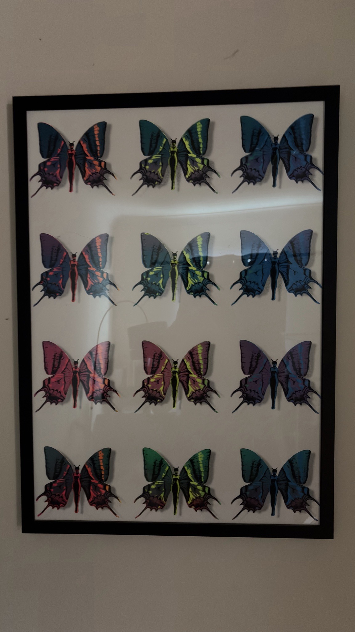 This contemporary artwork features a 4x3 grid of twelve stylized butterfly figures, each uniquely integrated with a central female silhouette in place of the insect's body. The composition showcases a vibrant various-color palette including electric blues, deep purples, neon greens, and hot pinks, set against a stark white background. The wings are rendered with intricate, hand-drawn detailing that mimics the patterns of swallowtail butterflies, featuring pointed 'tails' and segmented wing veins. The female figures at the center are simplified silhouettes, echoing a pop-art or street-art aesthetic popular in the late 20th and early 21st centuries. The piece is housed in a modern, slim-profile black frame with a matte finish. There is a slight visible shadow under each butterfly, suggesting a three-dimensional depth, which is a hallmark of high-quality print layering or 'butterfly collection' style art installations. The condition appears excellent with no visible fading, moisture damage, or glass cracks. The glass surface shows some external reflections, but the print remains well-preserved. This piece aligns with contemporary decorative art trends that blend natural motifs with human surrealism, often seen in the works of artists influenced by Damien Hirst or Salvador Dalí.