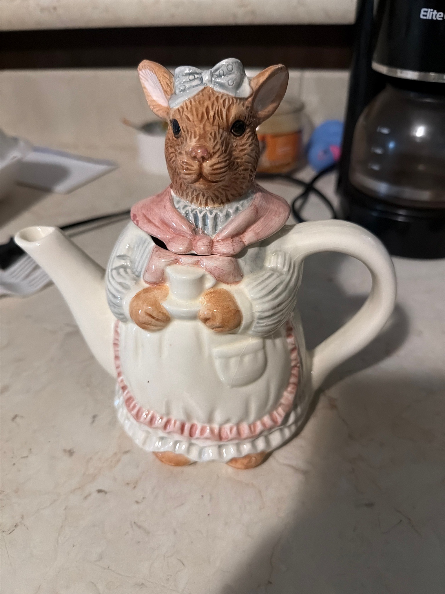 This is a whimsical, novelty ceramic teapot designed as an anthropomorphic rabbit character standing upright. The piece is constructed of slip-cast ceramic with a glossy overglaze finish. The rabbit 'mother' or 'maid' character is depicted wearing a cottage-style ensemble featuring a white ruffled apron with pink trim, a blue and white striped blouse, and a soft pink shawl tied in a bow at the neck. Notably, the rabbit is holding a miniature teacup and saucer in its paws, adding a meta-theatrical element to the design. The head of the rabbit functions as the teapot lid, featuring a textured brown 'fur' finish, upright ears, and a small white mobcap or bow. The creature's body serves as the main vessel, with a simple curved handle on its back and a spout emerging from its side. The style is highly reminiscent of mid-to-late 20th-century decorative ceramics, specifically those produced by companies like Fitz and Floyd or Otagiri, which specialized in such figurative kitchenware. The craftsmanship shows careful attention to molded details, such as the ridges in the fur and the ruffles of the apron. The condition appears fair to good with no immediate major cracks visible; however, there is a noticeable misalignment of the lid (head) against the body, and some slight glaze thinning or minor wear may be present on the protruding edges like the nose and ears. The base shows typical unglazed footing where the item rested in the kiln.