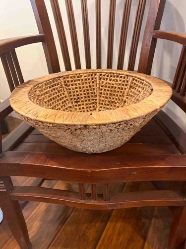 This is a large-format decorative bowl constructed of natural plant fibers, likely seagrass, hyacinth, or raffia. The piece features a complex, rustic construction characterized by an open-grid lattice weave on the interior, supported by thick vertical organic ribs. The exterior body possesses a dense, nubby texture consisting of knotted or coiled fibers, while the prominent wide rim is finished with a smooth, horizontal wrap of flattened fiber strips. The color is a consistent natural ochre or honey-tan, suggesting it has been kept indoors away from direct sunlight. Measuring approximately 14 to 16 inches in diameter, the bowl shows craftsmanship typical of late 20th-century or early 21st-century global artisan decor, often associated with African or Southeast Asian basketry styles. The condition appears to be excellent with no visible signs of broken fibers, unravelling, or structural sagging. There are no discernible maker's marks or tags visible in the photograph. The piece balances a rugged, primitive aesthetic with a highly structured geometric form.