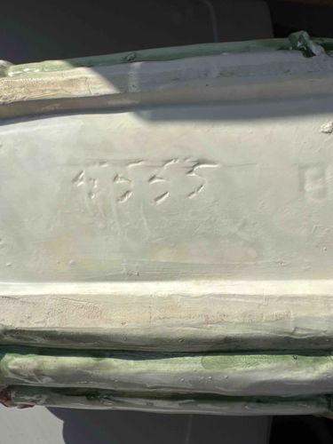 This is a rectangular ceramic pottery planter, appearing to be a mid-century piece characteristic of McCoy Pottery or similar American art pottery manufacturers. The base is constructed from a creamy-white earthenware clay body, featuring a shallow inset unglazed foot rim. The exterior displays a multi-toned green and white glaze application with possible pinkish undertones seen at the very edge, suggesting a floral or leaf-motif decorative theme common for planters of the 1940s-1950s. The most significant feature is the hand-incised mold or model number '4555' (or similar digit configuration) visible on the underside. The glaze work shows characteristic mid-century thick, drip-style application. Condition-wise, there is visible shelf wear on the raised edges, minor firing flaws in the form of small pockmarks or 'pinholes' in the glaze, and localized discoloration or staining on the unglazed portions of the bottom. No major cracks or structural repairs are immediately visible in this view, though some minor kiln stilt marks or manufacturing irregularities are present. The item likely dates to the post-war era of mass-produced decorative home accessories, known for its kitsch and functional aesthetic. The craftsmanship is industrial-grade but displays the charm of hand-finished molds and manually applied glazes.