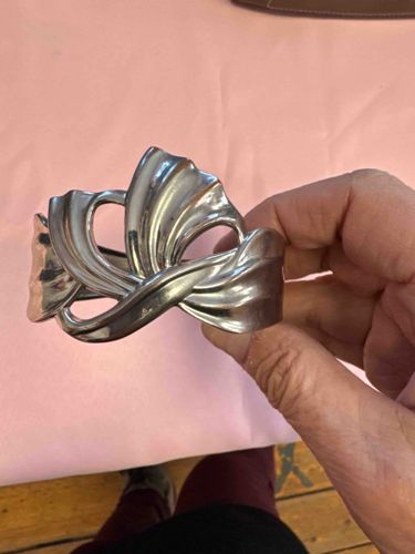 This is a substantial cuff-style bracelet crafted from a bright white metal, highly likely sterling silver given the sheen and traditional craftsmanship. The design features a bold, abstract flourish or ribbon-like motif with fluid, organic lines that create negative space throughout the centerpiece. The construction is heavy and cast, displaying a high-relief sculptural quality where the metallic 'ribbons' appear to overlap and fold over one another. In terms of physical characteristics, the bracelet has a polished finish with soft, rounded edges to the decorative elements. Notable features include the intricate openwork that suggests a mid-20th-century Modernist or late Art Deco influence, possibly dating from the 1940s to the 1960s. Regarding condition, the piece shows a light, natural patina in the recessed areas which enhances the depth of the design, along with minor surface micro-scratching consistent with age and occasional wear. There are no visible cracks, heavy dings, or signs of unprofessional repair. While the maker's mark is not visible in this specific angle, the complexity of the casting and the smoothness of the finish indicate a high level of artisan jewelry manufacturing. This piece is representative of statement jewelry intended to be a central focal point of an ensemble.