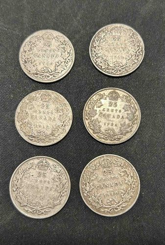 Lot of Six Canadian Silver Quarters (1910-1926)