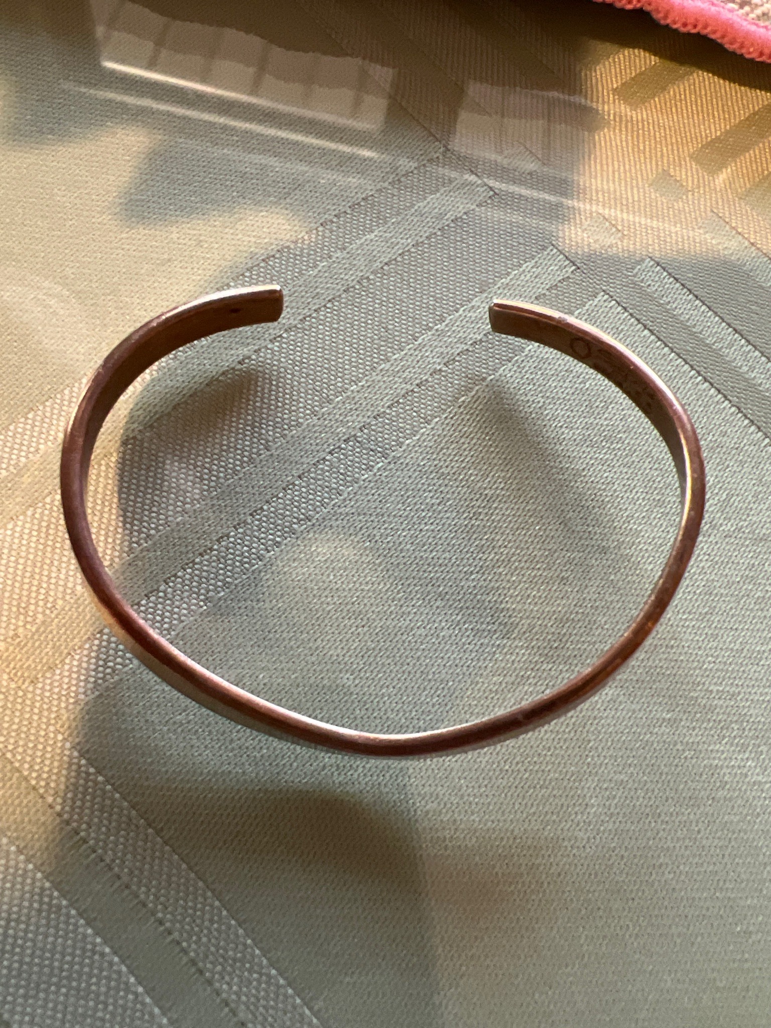 This item is a narrow, open-ended cuff bracelet crafted from copper, characterized by its reddish-brown metallic hue. The bracelet features a simple, elegant design with a slightly rounded exterior profile and a flat interior surface. The construction appears to be a solid band, typical of mid-20th century therapeutic or artisan jewelry styles. On the interior terminal end, there are visible stamped markings which include 'COPPER' and 'SABONA', identifying it as a product of the Sabona company, a well-known manufacturer of copper wristbands often worn for perceived wellness benefits. The metal exhibits a natural aged patina with some darkening and light oxidation consistent with regular use. The surface shows minor micro-scratches and subtle abrasions, but remains structurally sound with no significant bends or deformations. The smooth finish and rounded edges indicate a high level of craftsmanship intended for comfort and longevity. The piece likely dates from the late 20th century and represents a classic example of copper wellness jewelry, often sought for its minimalist aesthetic and rumored anti-inflammatory properties.