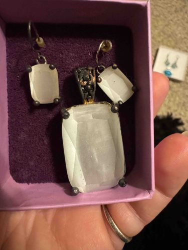 This jewelry set consists of a large rectangular pendant and a pair of matching drop earrings, presented in a small lavender or pink gift box lined with dark purple material. The set features large, translucent milky-white cushion-cut stones, which appear to be moonstone-effect glass or 'opalescent' art glass. Each stone is secured by a four-prong setting with dark, antiqued metal finish. The pendant features a decorative bail with a textured, beaded, or filigree-style pattern highlighting a late 20th-century aesthetic. The earrings are suspended from thin wire hooks, though one hook appears slightly bent from use. Regarding condition, there is notable oxidation and wear to the base metal, particularly where the gold-toned plating has worn away to reveal a darker substructure on the bail and prongs. There is also visible organic debris and surface grime consistent with long-term storage or frequent wear. The stones themselves show some surface abrasions and internal cloudiness typical of molded glass. The craftsmanship suggests a mass-produced costume jewelry line, possibly from the 1980s or 1990s, aiming to mimic the look of more expensive sterling silver and moonstone Victorian-style pieces. One of the earrings appears to be missing its standard rubber or metal safety back. No maker's marks or stamps are visible in this orientation.
