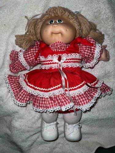 Vintage Cabbage Patch Kids Doll Estimated Era: Early–Mid 1980s Manufacturer: Coleco Condition: Near Mint / Very Good This is a vintage Cabbage Patch Kids doll with a soft cloth body and molded vinyl head. The doll features blonde yarn hair and blue eyes, with a distinct early Cabbage Patch facial sculpt. The doll is dressed in its original red and white gingham dress with white lace trim, paired with white socks and white shoes. The outfit appears complete and original to the doll. Markings & Tags: • Back of head is embossed “1983” • A “9” is embossed on the back of the head • Original cloth body tag is intact and reads “1982” • No paper adoption tag present Condition Notes: • Overall condition is near mint to very good • Minor blemish noted on one shoe; appears surface-level and likely cleanable • No major stains, tears, or damage observed to body or clothing This doll is representative of early Coleco production and retains strong collector appeal due to intact clothing and original cloth tag.