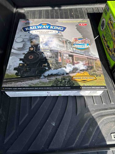 This item is a boxed 'Railway King Choo Choo Series' remote-controlled train set, manufactured by Fenfa or a similar mass-market toy producer. The large-format rectangular box features a prominent graphic of a vintage-style steam locomotive emitting smoke and light, pulling red passenger cars. Key features promoted on the packaging include 'Smoke Function', 'Intelligent Simulation Train', and synchronized sound effects that mimic real train actions. The set is noted as 'R/C' (Remote Controlled) and includes a variety of undisclosed accessories likely featuring track pieces and scenery. Physically, the box appears to be made of printed cardboard with a glossy finish, showing some minor edge wear and light creasing consistent with storage. Notable markings include the 'Railway King' branding in a blue arched banner and various technical icons on the bottom edge detailing light, smoke, and sound capabilities. This is a contemporary plastic toy set designed for children, intended to provide an immersive play experience with electronic features. The craftsmanship reflects modern injection-molded plastic mass production rather than a collector's scale model. Based on the branding and design, this likely dates from the late 2010s to early 2020s.